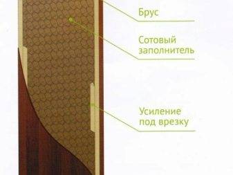 3) Внутреннего наполнения. Двери эконом-класса, как правило, полые либо заполнены сотовым картоном. В более дорогие изделия вкладывают тонкие рейки, создающие дополнительную шумоизоляцию.