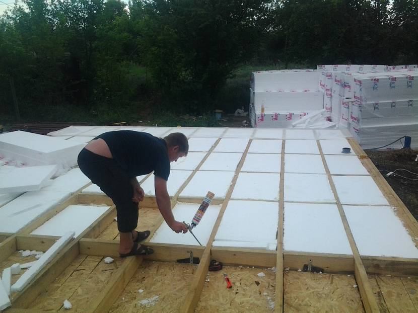 При утеплении пола по лагам листы пенополистирола укладываются на слой гидроизоляции, размещенный между деревянными брусками. Места стыковки плит закрывают монтажной пеной.