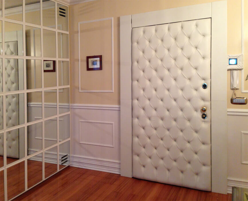 Еще один распространенный способ отделки – обтянуть полотно искусственной кожей. Кроме обивочной ткани потребуется утеплитель. Используется несколько разновидностей: