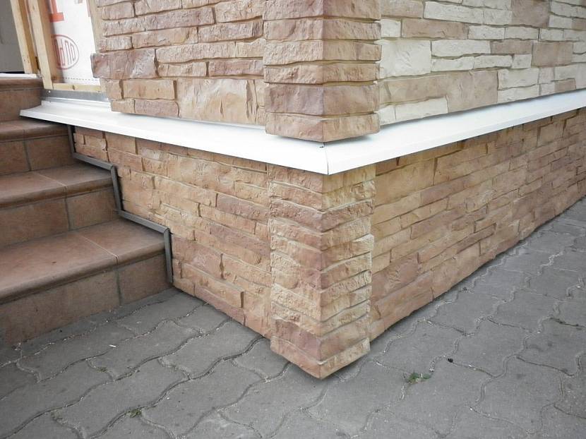 Нельзя не упомянуть о таком необходимом элементе отделки цоколя, как отливы. Если цоколь имеет вид ступени и выступает наружу, то этот пункт имеет особое значение, ведь без отливов не обойтись. Их основная задача – защита выступающей части фундамента от прямого попадания осадков.