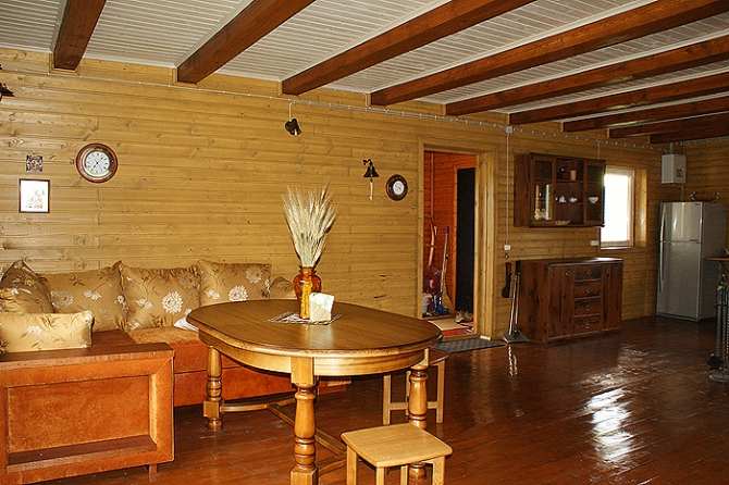 Предпочтение отдается деревянным потолкам, т.к. это экологически чистый материал, который обладает способностью дышать и великолепно сочетается с дачной атмосферой и не нарушает ее гармонии.