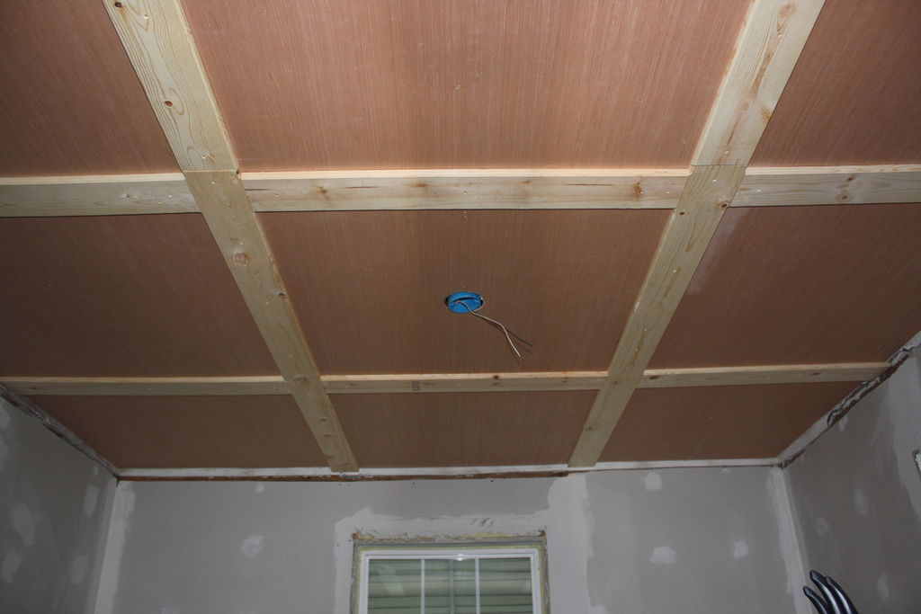 Начинать монтаж деревянного потолка нужно с обрешетки. Для того чтобы это сделать, возьмите толстую леску и натяните ее по середине и краям потолка. Точки натяжения отмечайте при помощи водного уровня. От самой выступающей части отступите 20 мм.