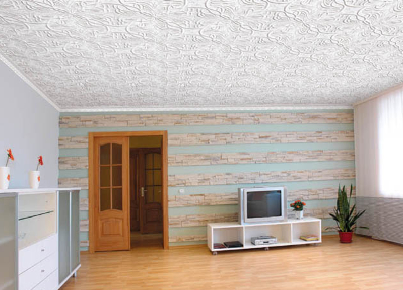 Моющие обои могут скрыть мелкие дефекты потолка. Пенопластовые плитки скрывают более существенные дефекты, но не подходят для потолков с большим перепадом высоты. С помощью подвесных конструкций можно замаскировать все недостатки потолка, спрятать коммуникации и дополнительно изолировать помещение от посторонних шумов и холода.