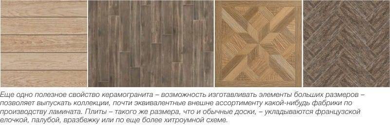 Нужно также учитывать, что керамогранитная плитка представлена во множестве дизайнерских решений. Здесь подходящий вариант нужно выбирать с учетом общего стиля помещения. Среди традиционных вариантов дизайна выделяют: