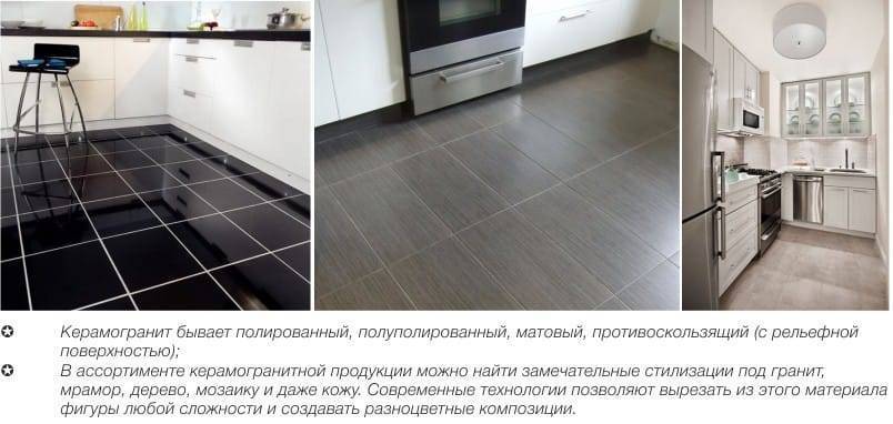 Практичнее будет покрыть пол керамогранитом. Как уже говорилось выше, он наиболее эффективен в условиях кухни с учетом того, какая влажность воздуха поддерживается в помещении, насколько интенсивны процесс жизнедеятельности и т.д.
