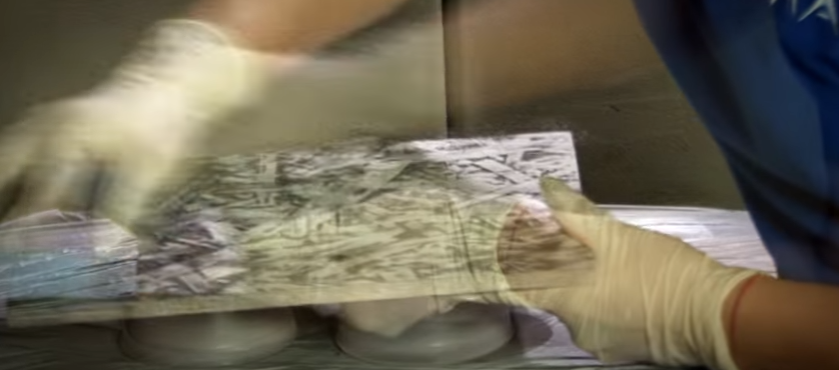 На этом этапе работ на панель наносят черную патину GM M048. Как и прежде, для этой цели используют аэрограф или пистолет-распылитель. Вес мокрого слоя должен составить 60-80 г/м2. На панели не должно быть просветов предыдущего белого слоя. Патина сохнет в течение 5-7 минут.