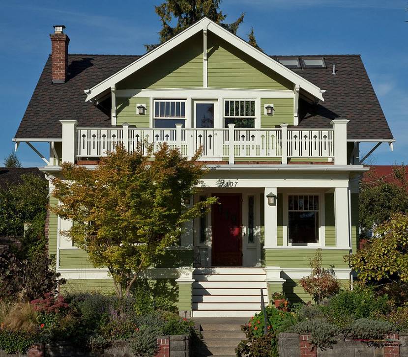 При расположении вокруг строения травяного газона, дом можно смело одеть в зеленые тона. Яркий фасад будет выделяться среди белоснежных равнин и желтой осенней листвы. Желательно красить в зеленый цвет дома, находящиеся большую часть дня не на солнечной стороне, иначе строение быстро потеряет контрастность оттенка.