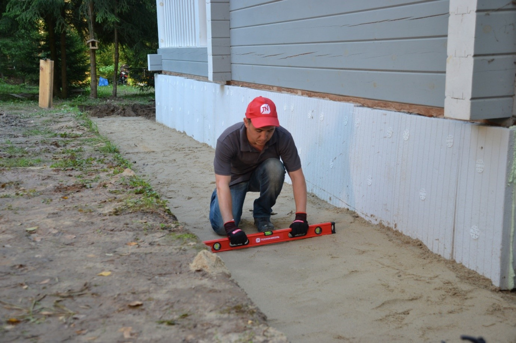 Укладываются плиты XPS на подготовленное песчаное основание с уклоном не менее 3 %. Их особенность заключается в наличии специальной L-кромки, которая позволяет перекрывать стыки. Если фундамент утеплен, то плиты утеплителя в отмостке так же плотно стыкуются с XPS на фундаменте. Если нет, то вертикальную часть цоколя выше уровня отмостки желательно также утеплить плитами XPS, в противном случае образуется мостик холода, и отмостка будет уже не так эффективна.