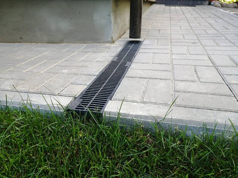 Вообще устройство дренажа непосредственно под отмосткой серьезно усложняет технологию ее устройства. Нужно рыть более глубокую траншею – с учетом диаметра закладываемых внутрь труб. Кроме того, сверху потребуется уложить еще один слой песка, а также слой щебня в качестве опоры для бетонной плиты. Чтобы избежать этого, дренажную систему проводят по внешнему периметру отмостки или же вовсе за ее пределами. Учитывая то, что сама отмостка обладает небольшим уклоном, для устройства ливневой канализации достаточно уложить водоотводящий лоток вдоль внешнего периметра бетонной плиты.