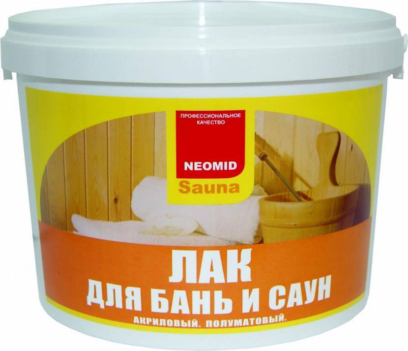 - NEOMID Sauna – полупрозрачный лак на основе акрила. Для защиты и отделки дерева в помещениях с повышенной влажностью.