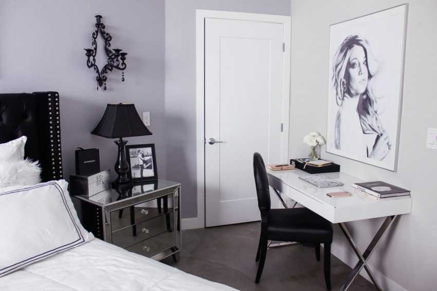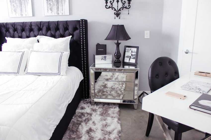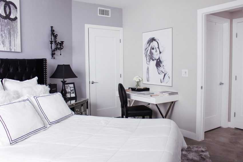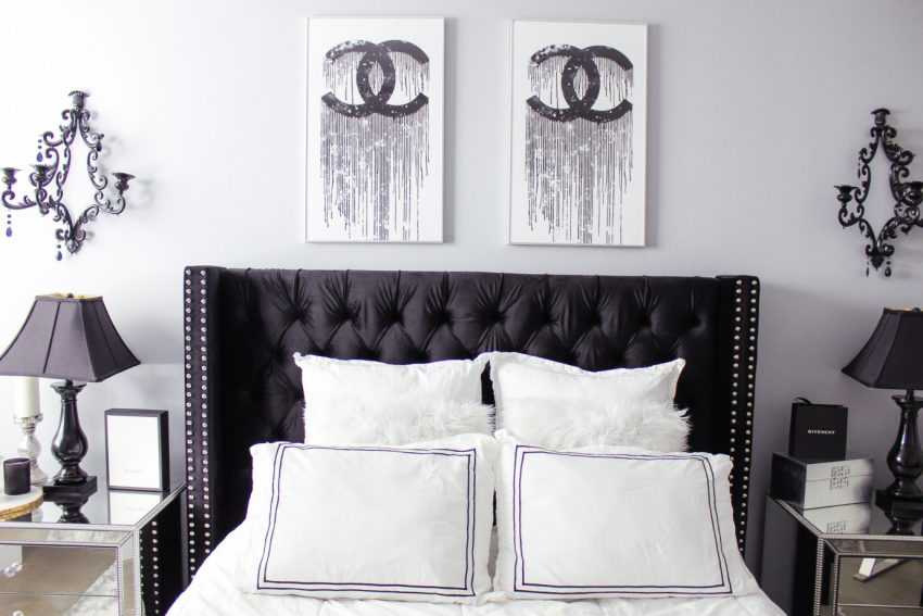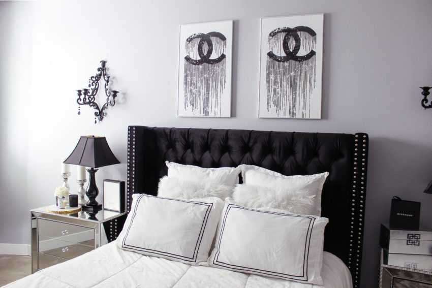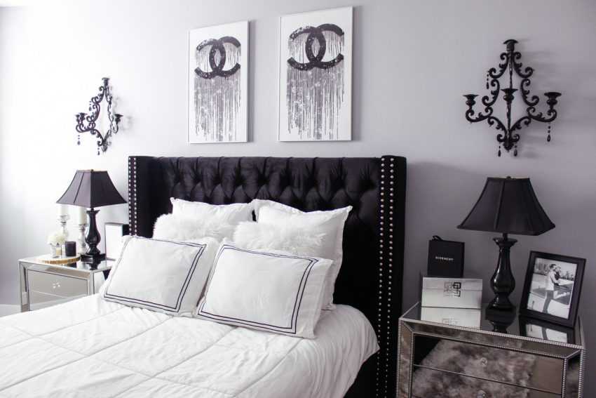 в черно-белой спальне лучше сделать хотя бы один акцент на яркое цветное пятно. Это поможет сделать ярче помещение; -