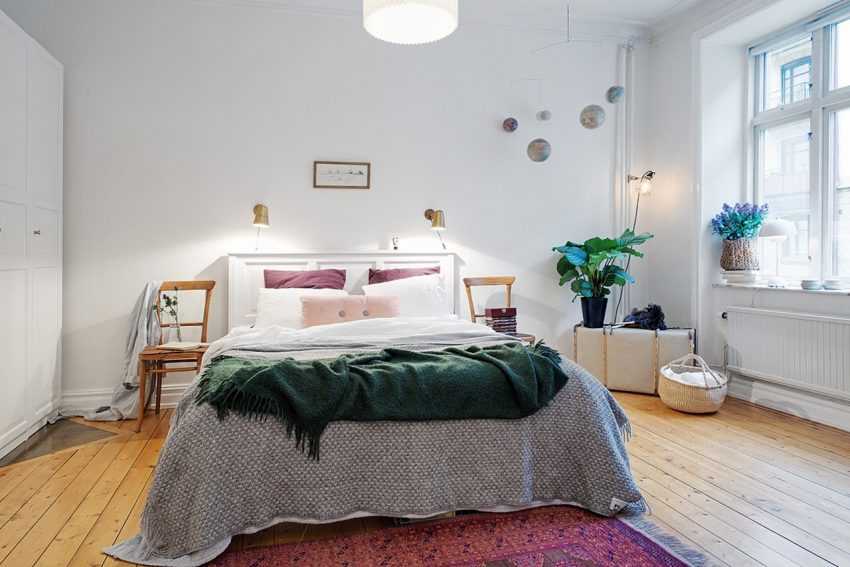 Красивыми и удобными элементами декора служат красивые бра и торшеры, ковер, декоративные полки для книг и украшений. В просторной спальне можно разместить большое живое растение в напольном керамическом горшке.