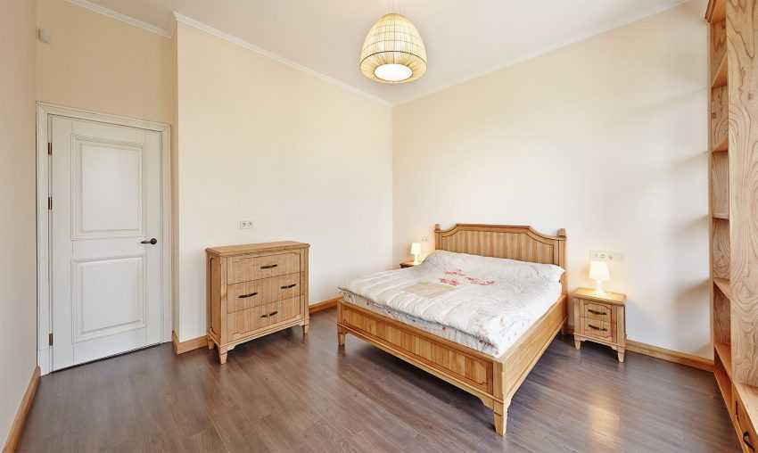 Дизайн спальни в бело-бежевых тонах является прекрасным фоном для предметов мебели из природной древесины. Такой вариант оформления выглядит благородно, декларируя свою оригинальность.