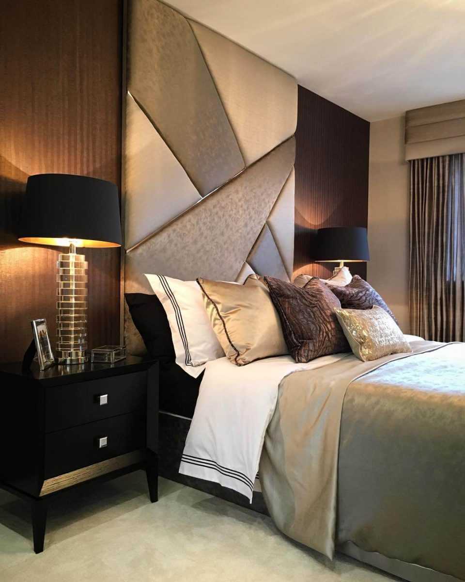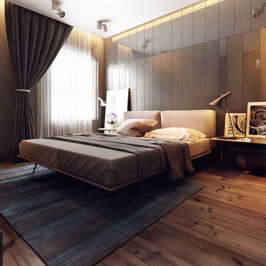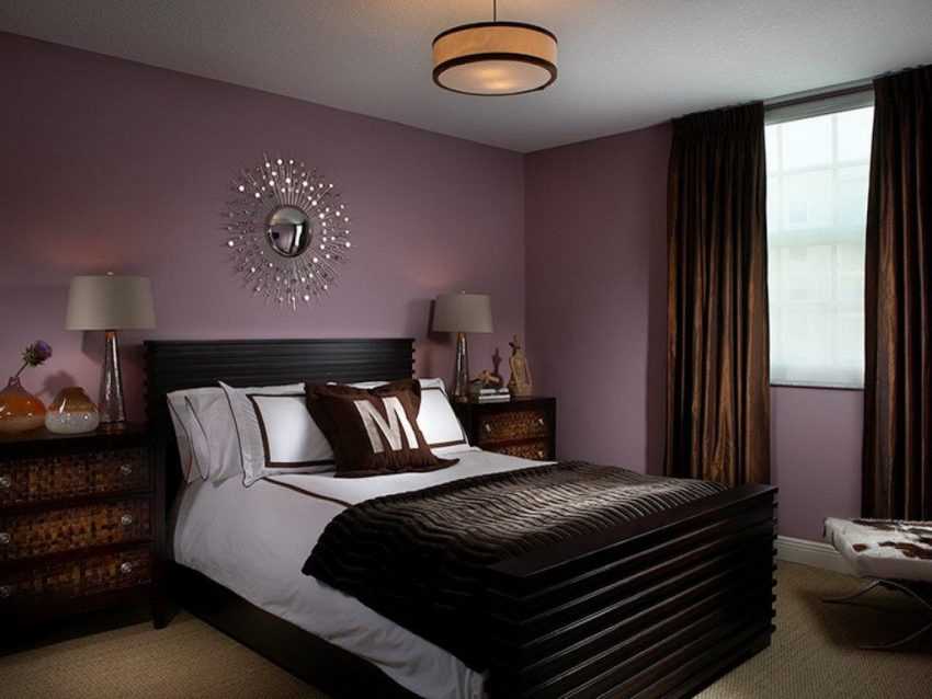 Важно! Чем меньше помещение, тем меньше темных оттенков в нем стоит использовать. Большая спальня, благодаря затемнениям станет уютнее, такими цветами легче сделать корректировку комнаты. . Стены оформляются рисунком или в одном тоне, при этом материал бывает каким угодно – темное дерево, обои, текстиль, краска