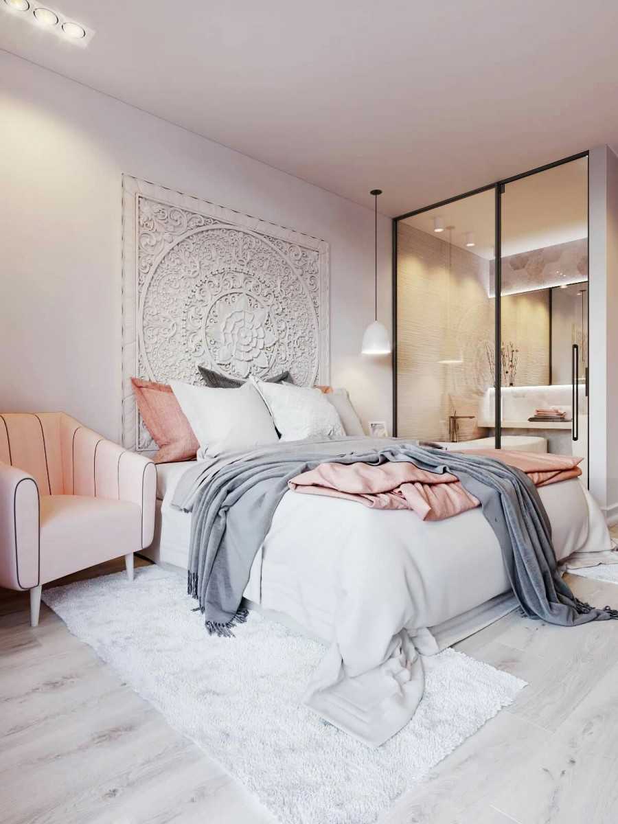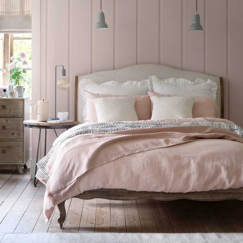Розовые стены в спальне должны быть «мягкими» — выбирайте пастельные оттенки розового, следите за сочетаемость, если планируется использовать несколько различных оттенков. Розовый не входит в основной цветовой спектр и относится к довольно сложным колерам.