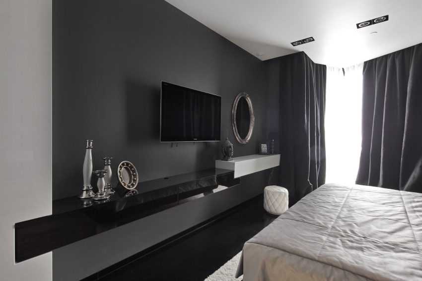 Одним из плюсов черного в спальне считается максимальная темнота, не дающая яркому солнцу или уличному освещению проникнуть сквозь шторы.