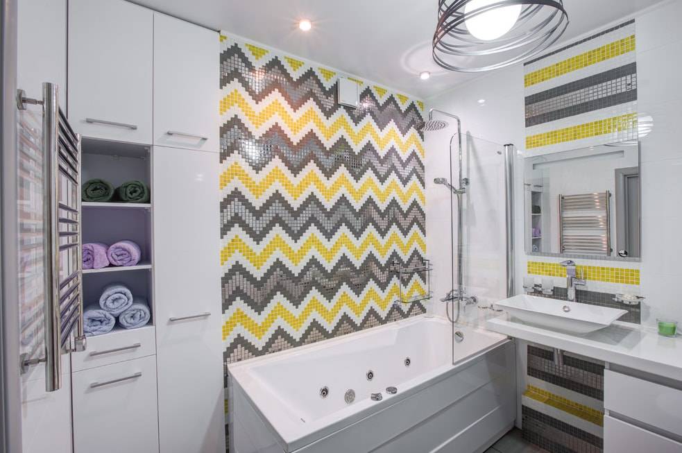 Желтый, белый и черный цвет – довольно необычные оттенки подобраны для дизайна ванной комнаты. Но при этом она выглядит очень креативно, светло и солнечно.