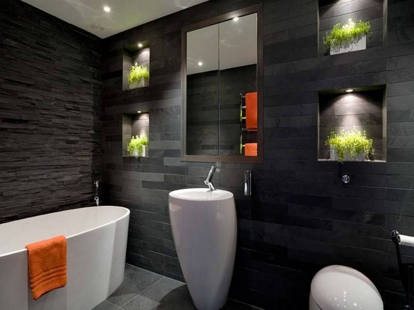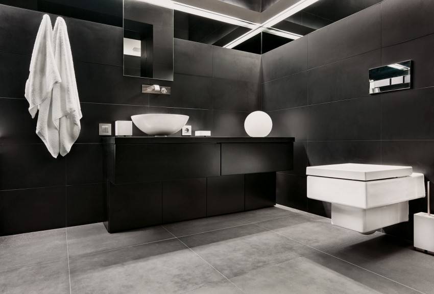 Прежде всего, необходимо помнить: любое помещение, оформляемое в темные тона, ванная здесь не исключение, должно быть само по себе достаточно просторным, поскольку черный цвет и его оттенки визуально скрадывают объем.