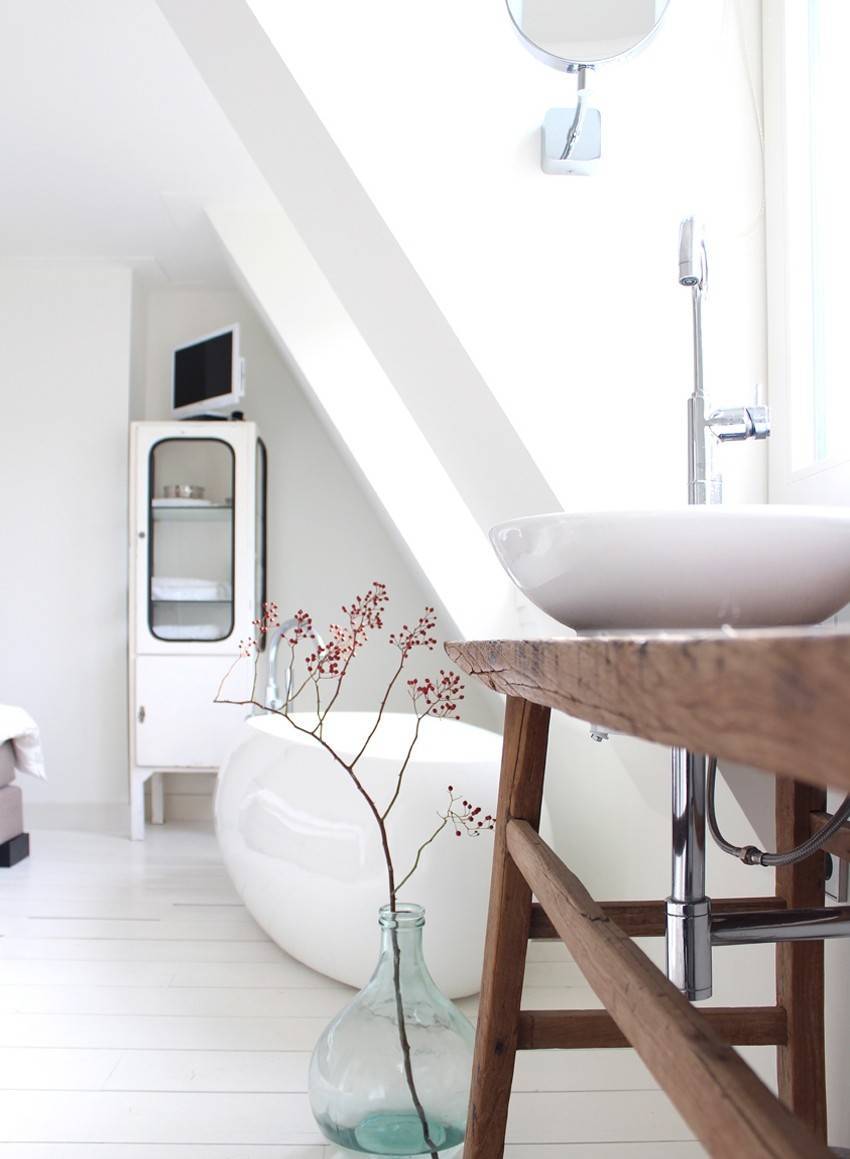- Нежные пастельные оттенки в сочетании с довольно грубыми элементами из дерева.