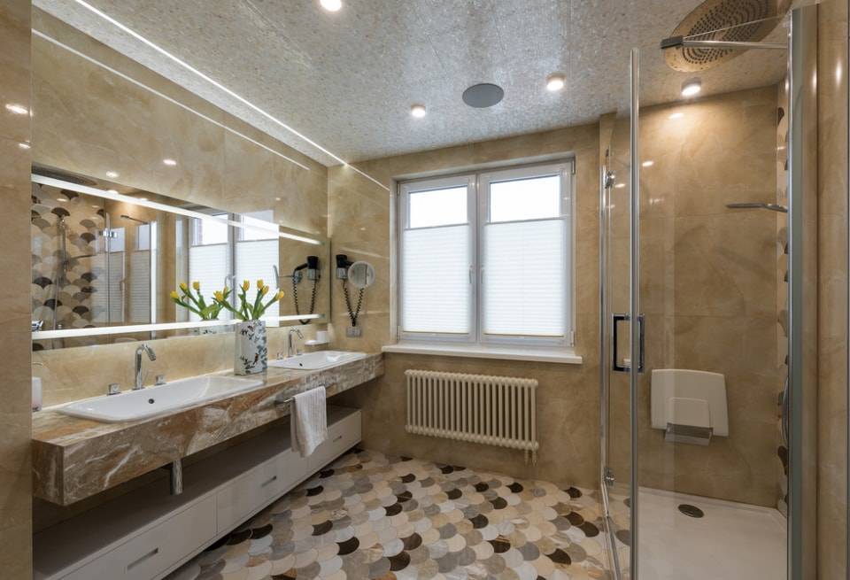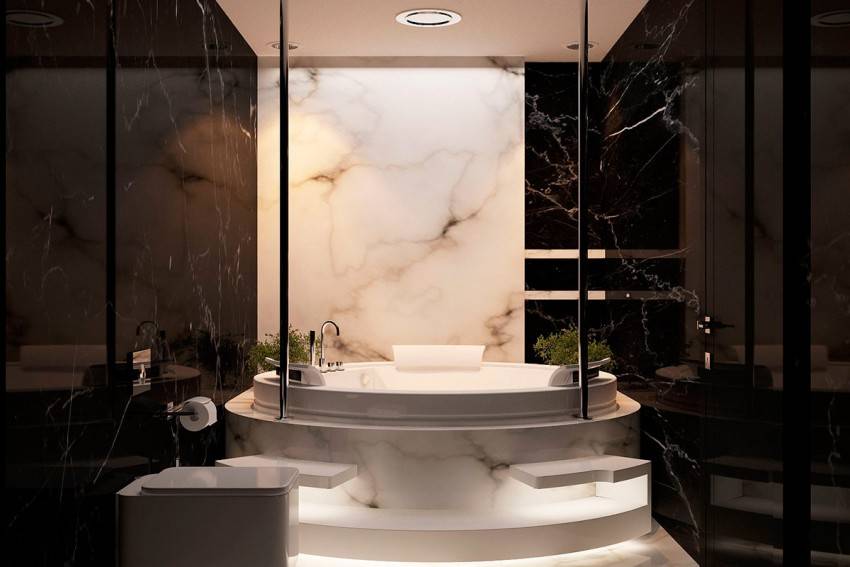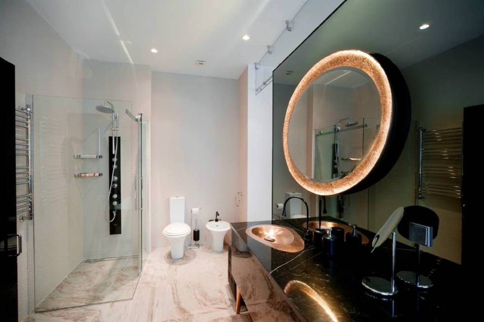 - большому помещению – солидное освещение, а значит, что чем больше ванная комната, тем более композиционно сложной и взвешенной должна быть система освещения (несколько уровней);