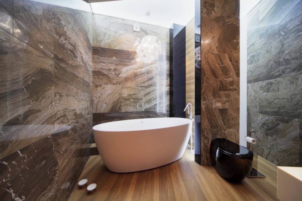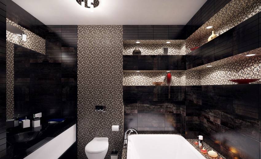 Используйте глянцевые темные поверхности в сочетании с блестящими, таким образом вы получите не только требуемую игру света, но и обеспечите безопасность. Речь идет о том, что бы блестящую плитку, а она более гладкая и оттого скользкая, для ванной комнаты это актуально, применять для отделки потолка и стен, создавая некий рисунок.