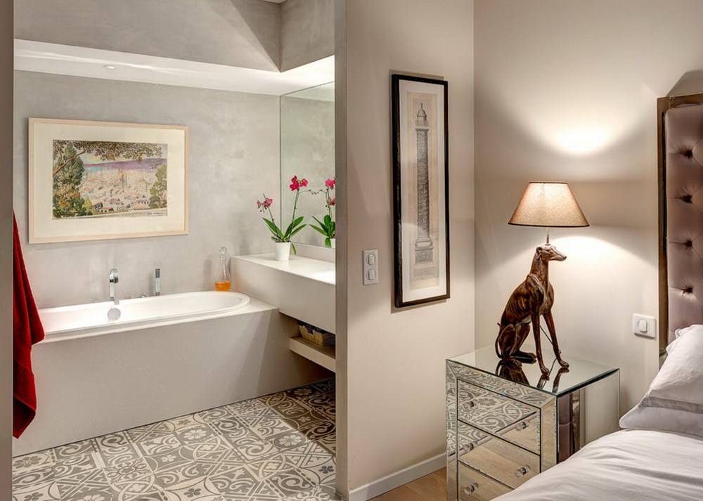 В Европе подобные совмещения раньше были распространенным явлением и подтверждение тому – многие исторические фильмы. Как же выглядит дизайн спальни с ванной в 2017 году? Это может быть объединенная со спальней ванна или продуманный проход из спальни в ванную комнату.