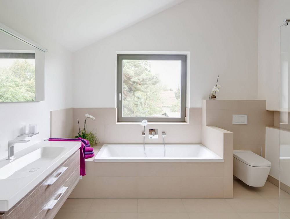 Преимуществами ванной с окнами считаются возможность украшения помещения живыми цветами, применения естественного освещения и зрительного расширения пространства.