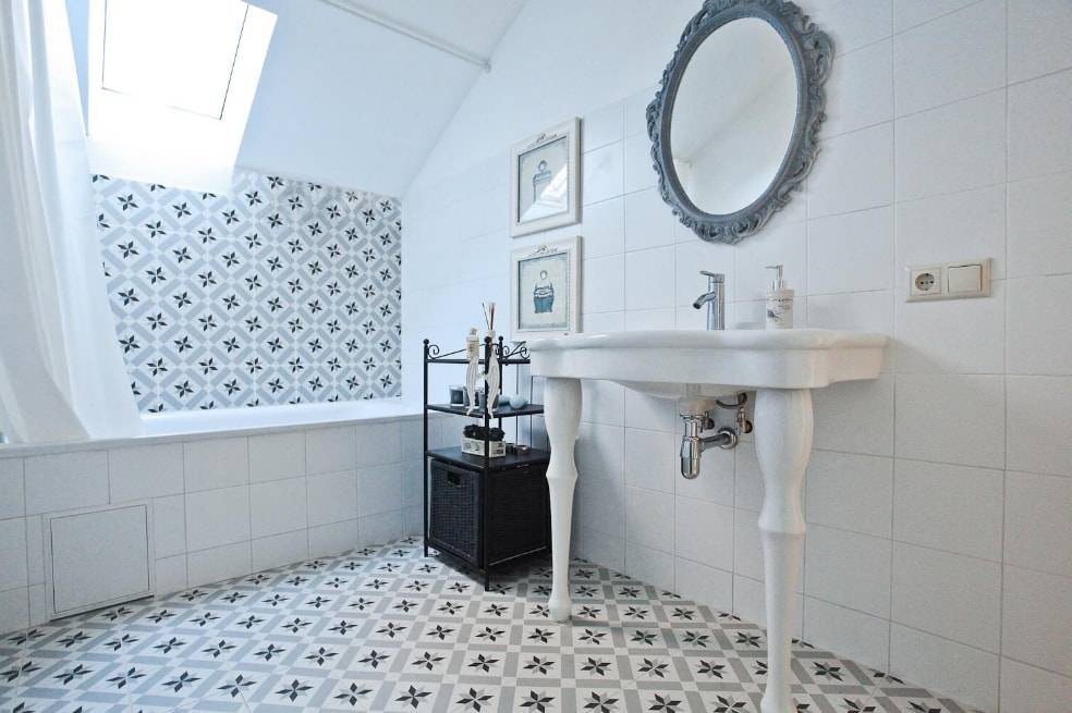 Черно-белый рисунок на плитке позволяет придать ванной комнате некой элегантности и стиля.