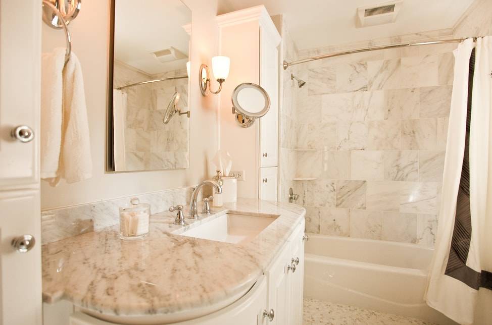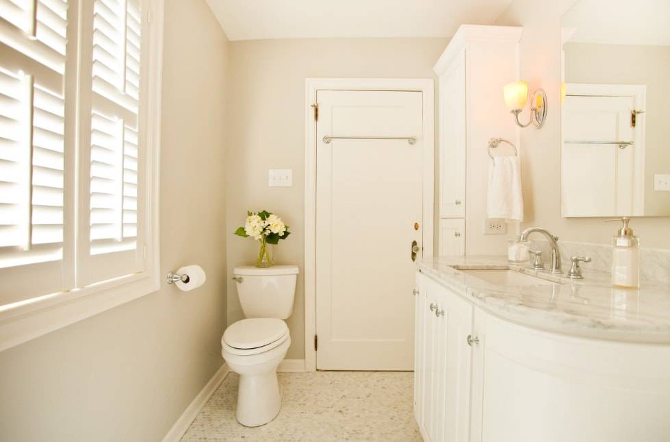 Чтобы зрительно увеличить пространство комнаты старайтесь использовать пастельные оттенки. Также очень хорошо выглядит белый цвет в сочетании с розовым, зеленым, желтым или же голубым. В качестве ярких акцентов лучше использовать оправу зеркала или же коврик.