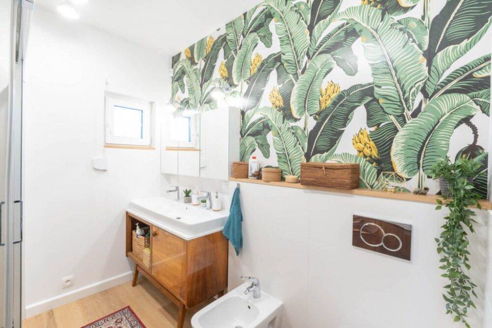 Обстановка ванных комнат 2020 года чрезвычайно смелая не только из-за использования ярких цветов. Обои с рисунком , к которым стремятся дизайнеры, также являются акцентом, который придает интерьеру характер и притягивает взгляд.