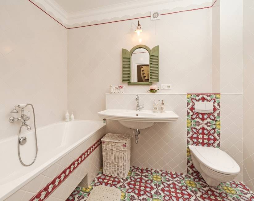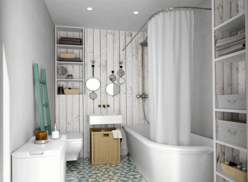В базовый набор составляющих интерьера входят: ванна, унитаз, раковина, зеркало, стиральная машина, полки, полотенцесушитель, зеркало. Расположение зависит от типа планировки и подвода коммуникаций. Ванну можно установить напротив либо справа от входной двери. Мойка располагается рядом с ней, над раковиной вешают зеркало с полками либо без них.