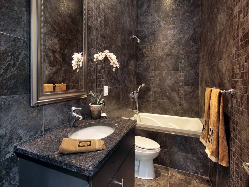 Начнем с того, что темная плитка в ванной – идеальное решение с любых точек зрения. Большое разнообразие цветовых оттенков, фактуры, прочность, стойкость к воздействию влаги и высоких температур – все эти характеристики позволяют назвать кафель материалом, будто-бы специально созданного для ванной комнаты. При всем том, существует несколько советов, следуя которым, вы сможете получить требуемый результат, а именно:
