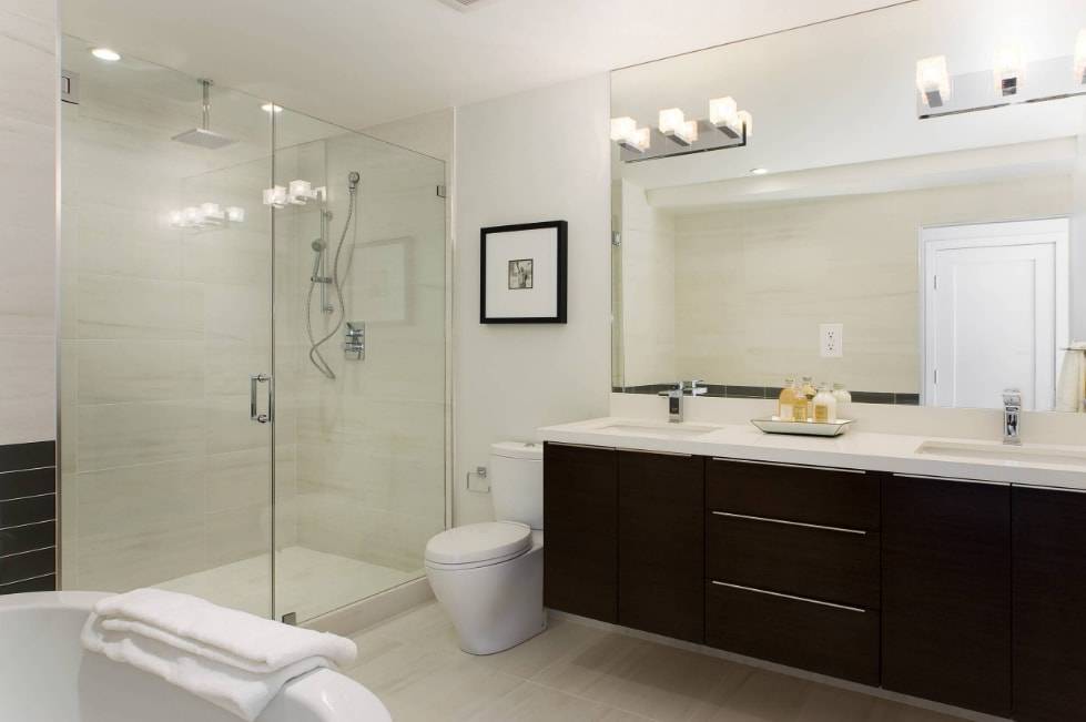 Строгий вариант ванной комнаты с четкими линиями и душевой кабиной из стекла.