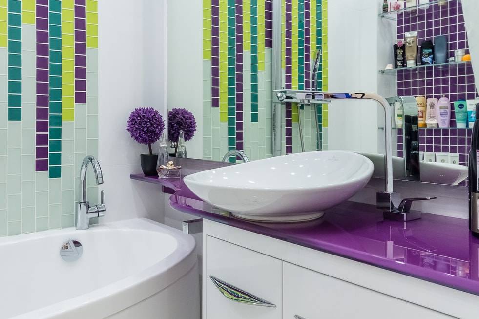 Оригинальное решение – сочетание белой ванной комнаты с яркими, насыщенными оттенками.