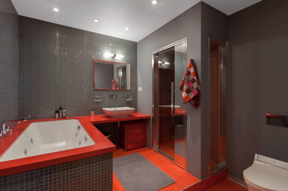 4. Красный цвет – очень активный, яркий и даже агрессивный. Поэтому его может выбрать далеко не каждый человек. Тем более, что ванная комната – это именно то место с которого начинается ваш день и заканчивается. А это значит, что здесь вы должны настраиваться на рабочий день и отдыхать от него же. И подойдет такой дизайн только успешным или творческим особам, которые ничего не боятся и смело идут вперед.