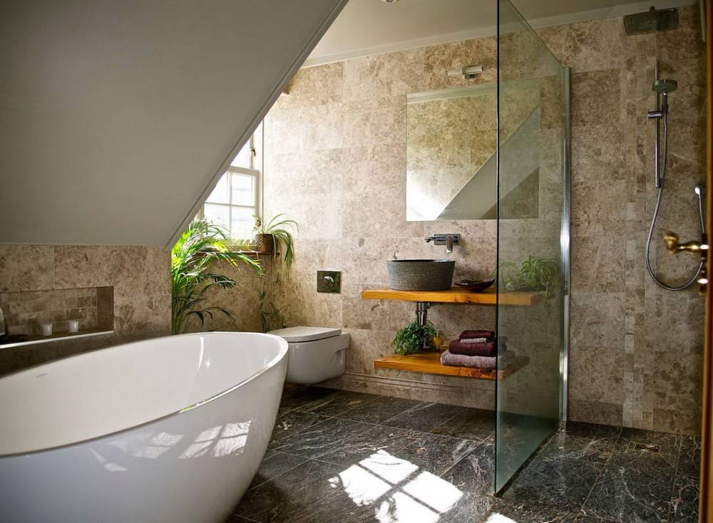 С помощью дикого камня, ракушек, изделий из лозы и т.д можно разнообразить комнату и создать нужную атмосферу. Но не переборщите с этим, ведь при обустройстве ванной в современном стиле, не забывайте придерживаться тенденции минимализма.