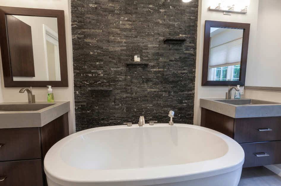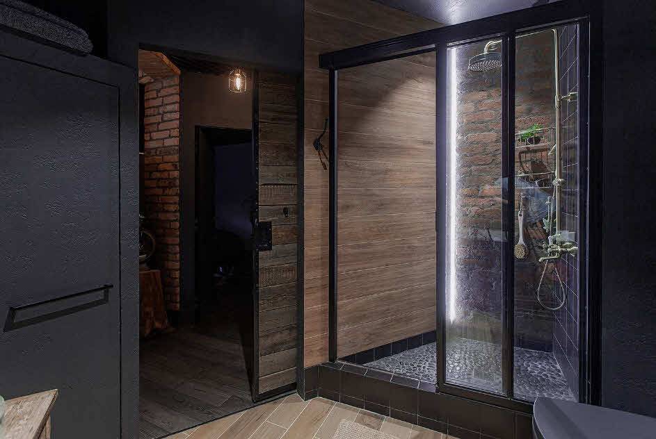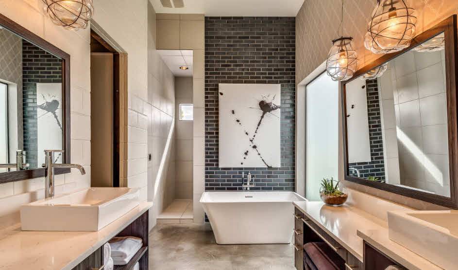 Если поэкспериментировать с оттенками, то монохромному интерьеру можно придать приятную живость. Черную плитку в ванной комнате можно перемешать не белым кафелем, а, скажем: