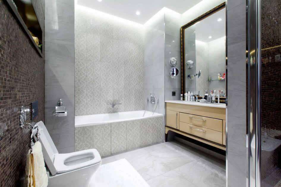 В стену, облицованную плиткой, можно вмонтировать зеркало, споты, декоративное панно. На фото ниже примеры комбинации керамики с зеркальным полотном.