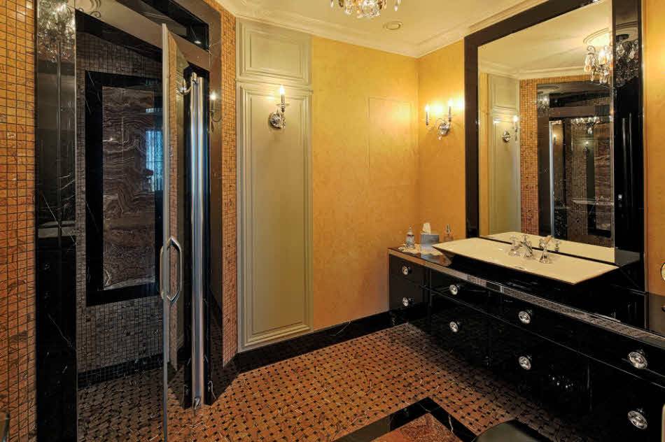Любую поверхность, будь то зеркало, столешница или даже потолок. Темными оттенками может быть отделан верх или низ помещения. Если хочется создать контраст, облицовывайте только половину комнаты или ее часть.