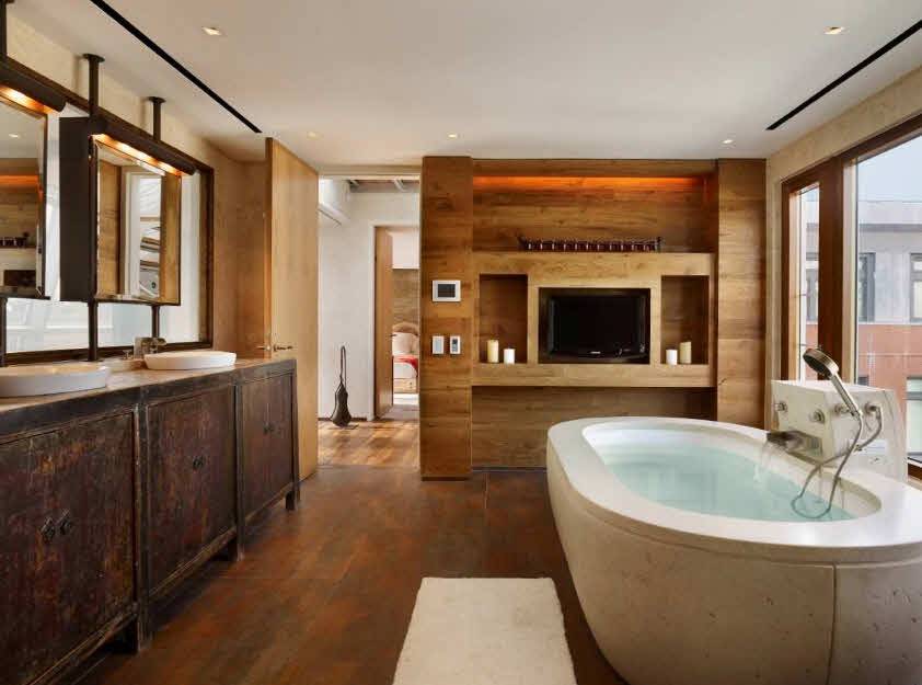 Частично или полностью можно облицевать санузел керамической плиткой под дерево. Чаще всего ее изготавливают в светлых тонах с вкраплениями темных оттенков.