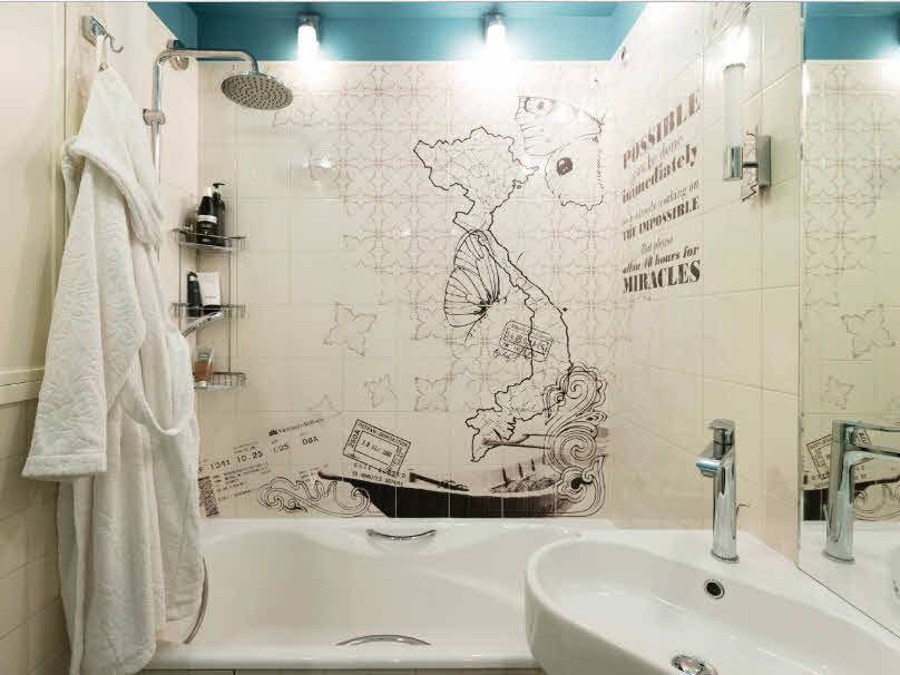 Для интересного и яркого дизайна выбирайте плиточный рисунок или узоры. Это могут быть цветы или орнамент. В ванной комнате будет уместен любой из придуманных вами вариантов.