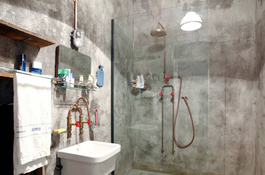 Фото показывает вариант облицовки стен графитовым цветом. Пол выложен серым крупным кафелем.