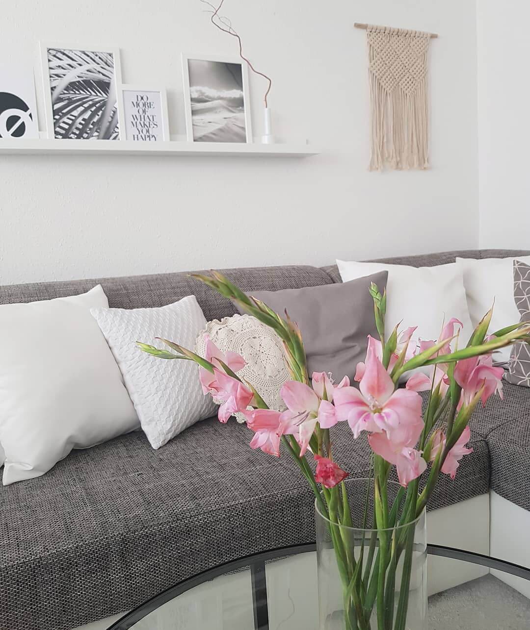 Нежные розовые гладиолусы подчеркивают легкость и воздушность гостиной.