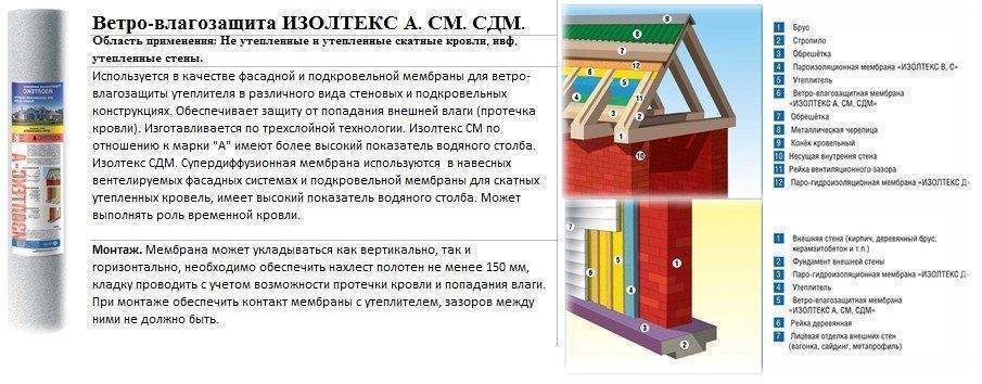 В качестве ветрозащиты и гидроизоляции рекомендуется использовать современные пародиффузионные влаговетрозащитные мембраны. Они пришли на смену пленкам. Основное преимущество такого материала — паропроницаемость. Мембрана не мешает дому «дышать» и эффективно отводит пар наружу, уберегая утеплитель от влаги.