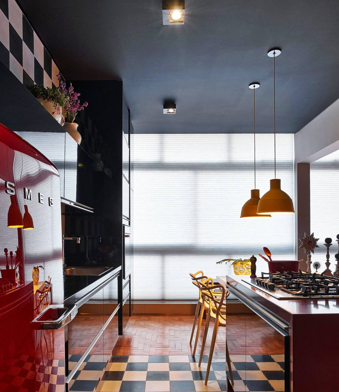 Интерьер кухни с черным потолком