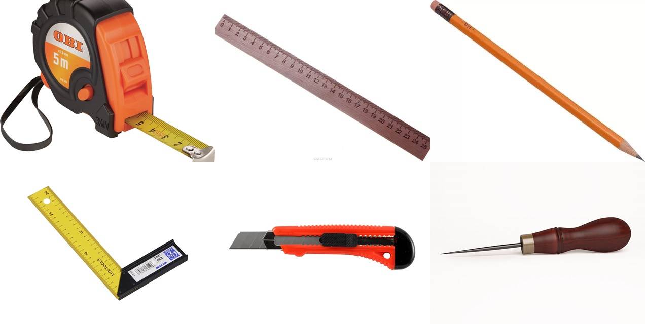 Для нанесения разметки и проведения измерительных действий понадобятся рулетка, линейка, карандаш, строительный угольник, канцелярский нож, шило.