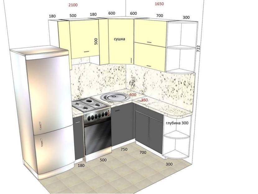 Если в проекте кухни используются стандартные кухонные угловые шкафы, то по чертежу несложно будет «подогнать» размеры. Типовой верхний угловой шкаф 600х600, а нижний – 900х900мм, 950х950мм или 1000х1000мм. Но, поскольку верх и низ отделяется визуально общей столешницей, каким-то мотивом и дополнительным декором на фартуке, некоторый сдвиг не будет заметен. В любом случае, относительно плиты (варочной поверхности), окончанию ряда он выравнивается автоматически.