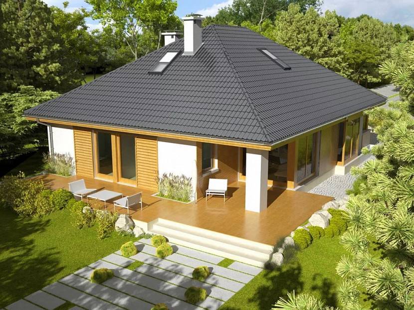 Вальмовая (четырехскатная) крыша придает дому изысканный вид. Особая конструкция кровли позволяет дополнительно защитить само строение, его стены от воздействия влаги. Поэтому строительство крыши с четырьмя скатами оптимально для регионов с повышенным количеством осадков и сильными ветрами.