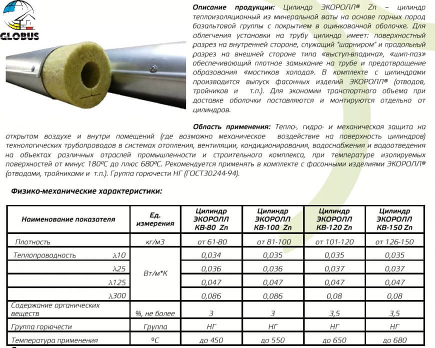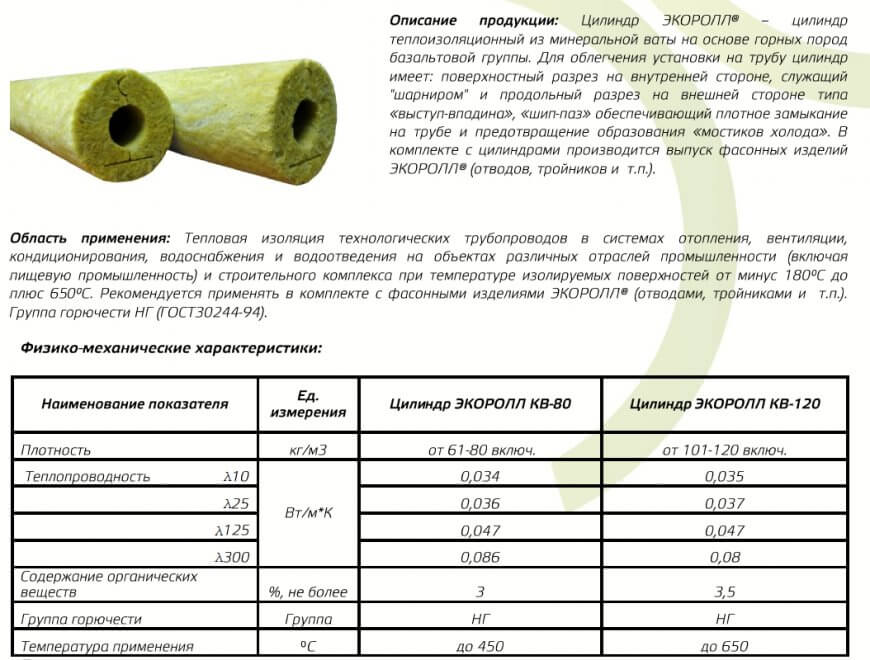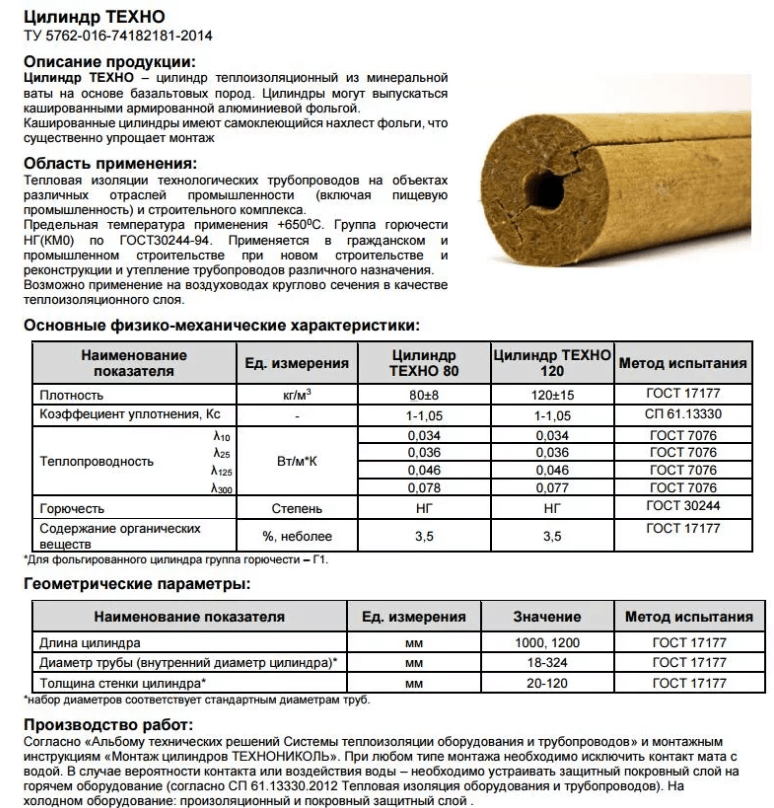 Технические характеристики цилиндров совпадают с плотной каменной ватой. Для наглядности они представлены в виде таблицы: