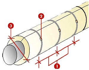 - Цилиндрические утеплители для труб не имеющие фольгированного покрытия, требуется стянуть кусками проволоки. Проволочные хомуты, могут размещать на расстоянии друг от друга не превышающего 300 мм. Также, стоит помнить, что при наружной окружности изделия, не превышающего 500 мм, рекомендуется использовать проволоку. В таком же случае, если диаметр больше 500 мм, то лучше воспользоваться металлической лентой.